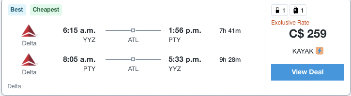 Delta is showing cheap flights to Panama (the country) from Toronto for only $259 CAD roundtrip including taxes
