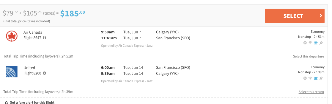 2. Search for Calgary (YYC) to San Francisco (SFO) roundtrip